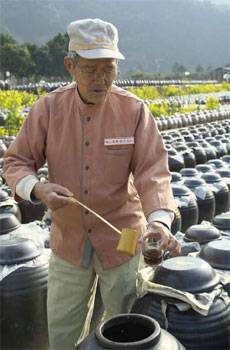 ここでつくられる黒酢・桷志田は、酢になってから2年以上熟成させたもの。